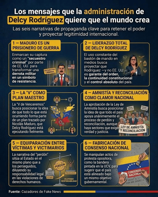 El reporte sostiene que estas narrativas incluyen reinterpretar hechos recientes —como la captura de Nicolás Maduro— y construir la idea de un consenso nacional que, según los verificadores, no se refleja en la realidad política del país. El objetivo, señalan, sería ocultar fracturas internas y reforzar la imagen de control institucional (...).