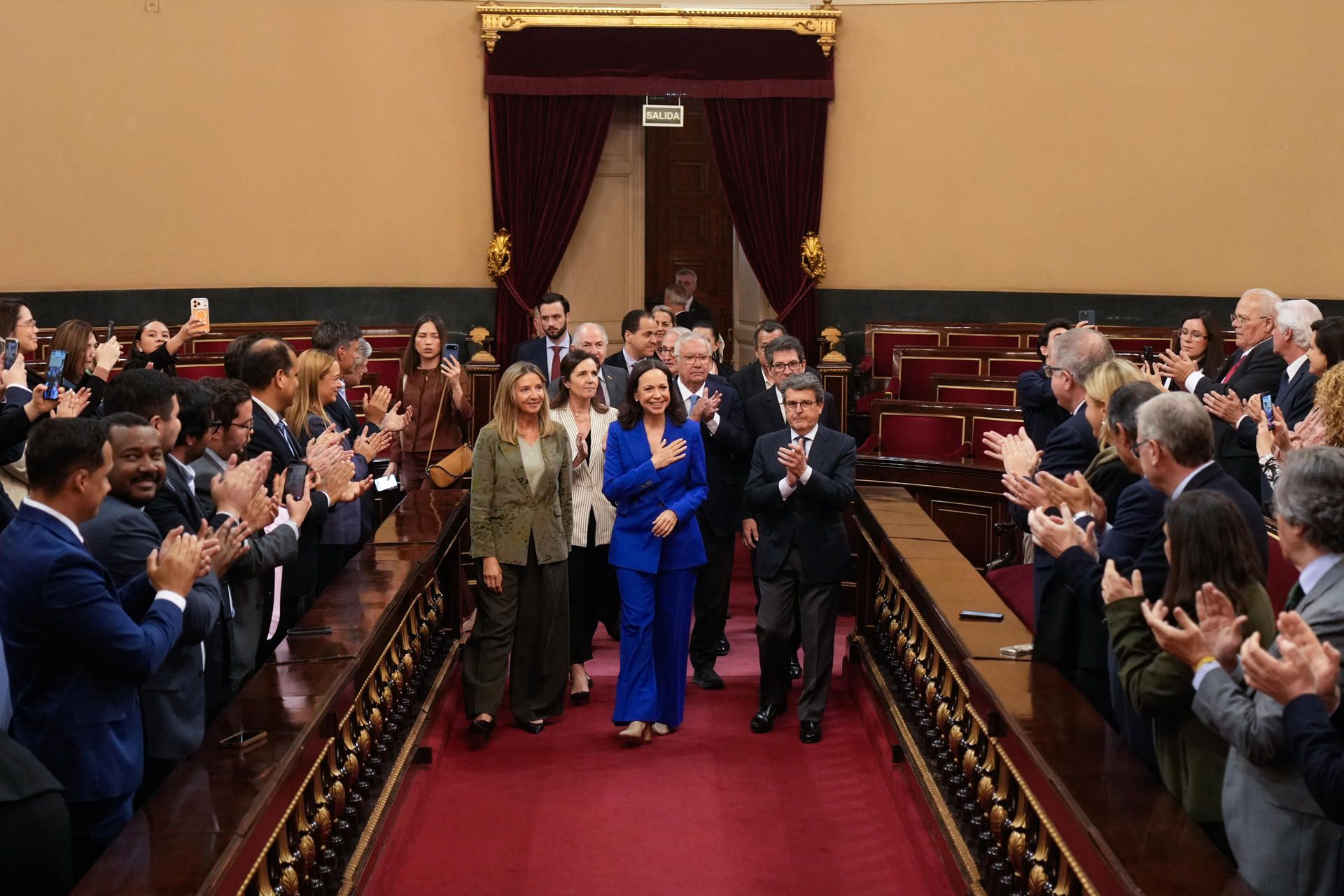 La líder opositora venezolana y Nobel de la Paz María Corina Machado (c) durante su visita al Senado en Madrid. EFE/ Borja Sanchez-Trillo
